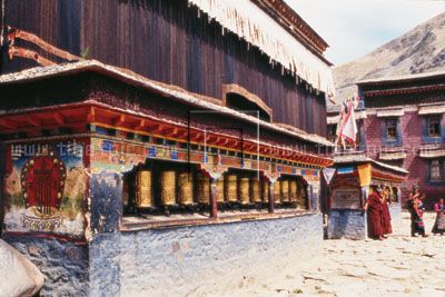 薛札拉康:位于拉康钦莫大殿南侧。门向南,门廊2柱,廊壁绘有释迦牟尼传记、四大洲世界、六趣图等。拉康内有柱18根(3×6排列),中间2长柱托起天窗。殿凤主供释迦牟尼佛,其左右两则供奉强巴佛、金刚佛母、金刚持、度母、萨班·贡噶坚赞等造像,高约0.7~1.35米;东、西两壁及北壁两端置有木制佛龛,内供37尊普贤大如来佛(即贡日佛),高0.68~0.75米,系合金、鎏金铜质;壁画彩绘圣僧图(东尊丹巴)、八舞女(扎西改杰)等内容。