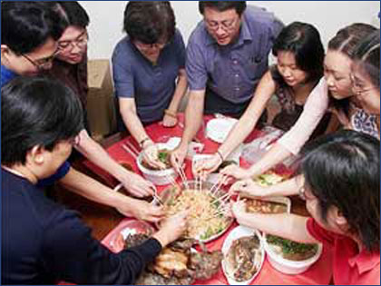 “老苏州”们回到家,桌上摆好的“圆夜饭”不仅丰盛更是有“意思”,无论是冷盆热炒还是鱼肉牲禽,都换了雅名成了“吉祥菜”,“元宝”(蛋饺)、“团圆”(肉圆)、“鸡”(扑扑腾),“金链条”(粉条)、“如意菜”(黄豆芽)、“吃有余”(鱼)等,形色相似,处处渗透着姑苏传统节庆的喜气和寓意。