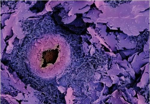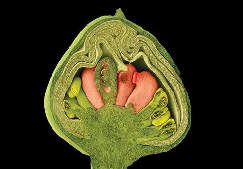 这是一种生长在中美洲和南美洲地区的花蕾,它呈现出结成果实之前的美丽。如图,在这个花蕾切面中橙黄色结构叫做心皮(carpels),当花朵 传授花粉之后,心皮就会膨胀成为果实。在心皮纵向切面中部是胚珠,它能够发育形成种子。在花蕾边缘处是清晰可见的花粉囊,其中还有一些花粉粒。