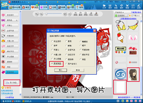 4.打开图片后,在“饰品”菜单下“导入物品”,将第一张照片和全部涂白后保存的照片,都导入到“其他饰品”中,备用。