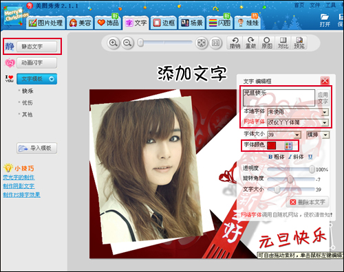 7.贺卡的主体已经做好了,现在就缺些文字部分了,我要给朋友们写的祝词当然会保密啦。这里就先写上大众化的“元旦快乐”,再选择字体和字体的大小颜色等。