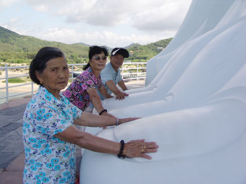 “我们是第一次来三亚南山,是在儿子和儿媳妇的鼓动下出行的”,张大宗一边扇着随身携带的一把扇,一边很开心地说,“今天春节,我的儿子及儿媳妇去三亚南山旅游,回来后就一直鼓动我们几个老的一定要去看看。这次禅修游,也是儿子预订安排的。”