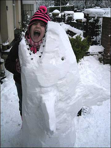 近日,英国全境普降大雪。在威尔士Tredegar小镇,一个小女孩和雪鲨鱼合影。