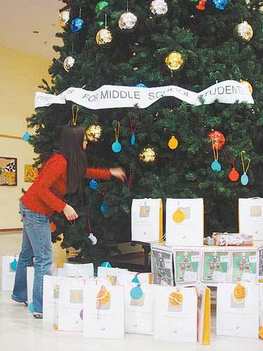 临近圣诞节,那棵接近两层楼高的圣诞树上,已经缀满了五彩斑斓的饰品和写着受助学生信息的卡片。此时,树下也堆满了整整70份打包好的礼品袋,里面装着“佳洁士牙膏”、“中华牌铅笔”、“德芙巧克力”……据说,剩下的礼物将在3天内筹备完成。