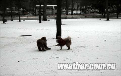 今天凌晨,北京出现降雪,雪中小狗嬉戏(李景旸 摄)