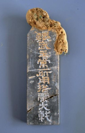此次考古发掘,大墓出土、征集刻铭石牌及“慰项石”数量多达60件,专家说,这类形制、质地的文物应为首次考古发现,也基本未见于传世品之中。除“魏武王”这一谥号外,其它刻铭内容均为随葬用品的名称和数量,种类较多。潘伟斌提醒大家,刻有“魏武王”铭文的同类圭形石牌共有8件,其中只有1件是从盗墓分子手中追缴而来的,其它7件均为科学发掘出土。“慰项石”是警方追缴而来,其形制不同于其它石牌,但刻铭内容与刻有“魏武王”的石牌类同。