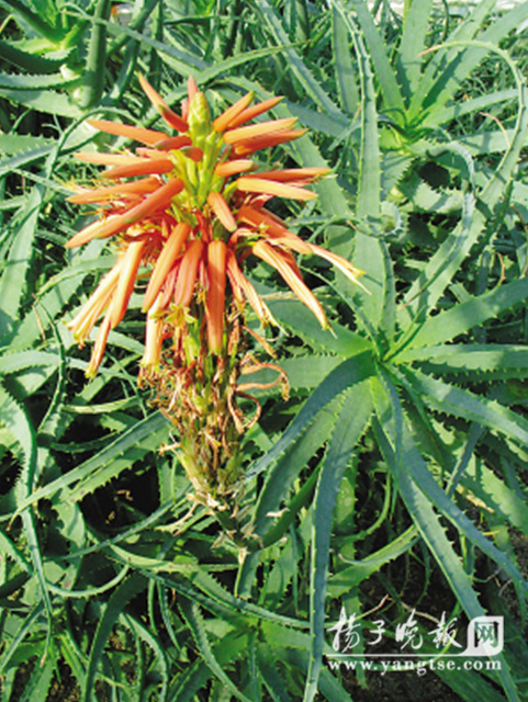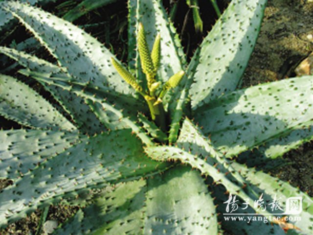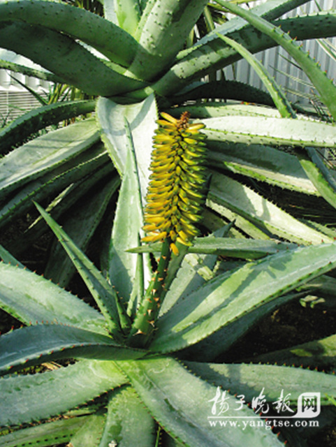 昨天上午,记者来到中山植物园南园,走入温室,园艺工程师们正忙着用喷壶给一些植物补水,在15℃的温度环境下,各种植物都生机勃勃。一片星星点点的橘红色吸引了记者,走近一看,竟然是芦荟开花了,而且还不止一种呢!结成串的“小辣椒”是木立芦荟,它还有一个名字叫“章鱼芦荟”,厚厚的叶片就像一只只张牙舞爪的章鱼,浑身长满刺,看上去很是“泼辣”。还有一种珊瑚芦荟,同样是开着橘红色的小花,花朵就像一只只小灯笼,非常喜庆。旁边的南非芦荟则显得比较粗犷,中间窜出一根“玉米棒”,“还在生长,花也是红色的,春节左右花会盛开,就像火把一样。”园艺工程师耿蕾介绍说,这种芦荟来自南非,在温室落户才两年多,在当地它和南京的法国梧桐一样有名,能作为行道树,“估计有10多米高,就像小椰子树一样。”还有一种山芦荟,也冒出了一些小黄花,估计一个月左右也会盛开,因为它的原产地是南非的荒漠地区,为了防止动物啃食,它身上的刺明显要比其他品种更密。
