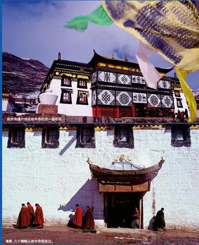 寺院在群山的环抱中静静地伫立着,飘舞的经幡传递出浓浓的宗教气息,虔诚的信徒磕着等身长头来此转经。转动的经轮转去了今生的苦难,转来了来世的幸福。独特的地理环境、秀美的山川以及民风民俗组成了郎木寺的一切,汉、藏、回3个民族的居民都在白龙江畔浣衣汲水,呼吸一方清新的空气,过着平静安稳的幸福日子。