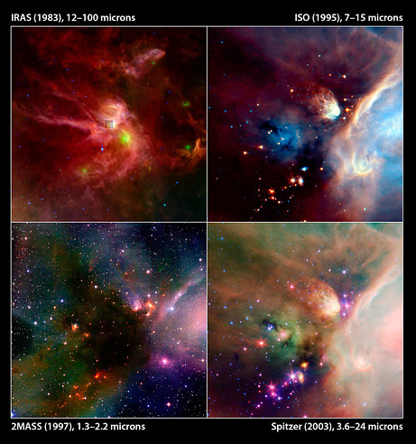 这是蛇夫座(Rho Ophiuchi)恒星形成区的四张照片,集中展现了过去25年红外天文学的“进化”。四张图以时间为顺序排列,每一张都是由过去或当前美国参与管理的红外天文台拍摄的:红外线天文卫星(IRAS)、红外线太空天文台(ISO)、2微米全天巡天(2MASS)望远镜、“斯皮策”太空望远镜。红外光是肉眼所看不见的,所以,红外处理与分析中心对四张照片进行了假色处理,帮助天文学家进一步理解恒星在蛇夫座的形成过程。不同颜色代表不同的尘埃温度和构成,以及形成于稠密分子云中的数百颗恒星的不同年龄。
