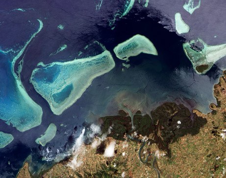 在这张由美宇航局“地球观测者1号”卫星12月18日拍摄的真色照片中,南太平洋岛国斐济最大岛屿维提岛附近巴河三角洲(右下角)周围到处是深绿色的红树林。红树林可以帮助保护其附近覆盖广但却脆弱的珊瑚礁(淡蓝色)。红树林扎根于浅浅的海底,经常给予小鱼以无微不至的保护,直至它们能依靠珊瑚礁生活。树根还会捕获河流沉积物和农业径流。河流沉积物会与珊瑚礁争抢生存所需的阳光,而农业径流则会助长有害藻类的生长。作为回报,珊瑚礁会令剧烈冲击海岸的波浪速度减缓下来,从而保护红树林树根免遭巨大涡流的侵袭。