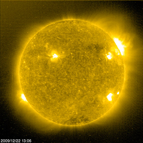 在这张太阳与日光层天文台(SOHO)于12月22日拍摄的紫外照片上,五个区域的磁场活动使太阳盘面闪耀着亮色斑点。在以可见光看太阳时,其中两个区域类似于“黑色”的太阳黑子。这是太阳与日光层天文台在2009年首次捕捉到太阳上几乎同时发生的剧烈活动。科学家表示,这或许预示着太阳罕见的漫长安静期的结束。