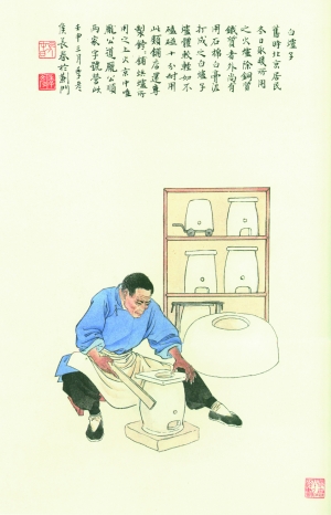 早年北京居民冬天取暖用的炉子,除了铜铁铸造的和铁板打制的以外,还有一种用石棉和白矸子土塑成的白炉子。加工时先把白色的泥土用手塑成坯子,半干时再以竹板拍打,非常光滑平整。干后,有的装上铁架或小推车,这种泥制的火炉如不磕碰十分耐用。这类作坊除制作取暖的白炉子外,还做饽饽铺烙制饽饽用的上火。北京城只有旁公道(交道口)、庞公顺(东四)两家制作?