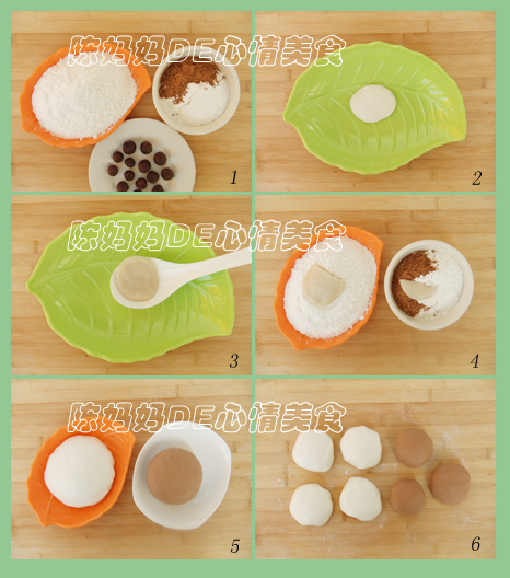 1、把糯米粉分成两份:一份150克、一份50克。50克糯米粉里加入可可粉。豆沙馅搓成大小不等的球状备用;