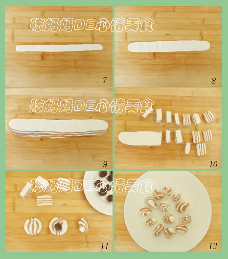9、剩下的面团依次搓长、按扁,一层白色,一层褐色,白、褐相间依次摞起来,再轻轻按一按;