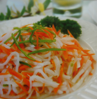 1.红,白萝卜去皮切丝,放入碗中,加上少许盐巴,腌制15分钟。