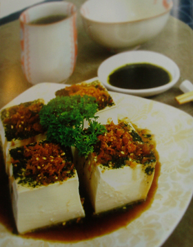 2.将香椿酱,酱油,麻油混合拌匀,淋在豆腐上并撒素肉松,即可食用。
