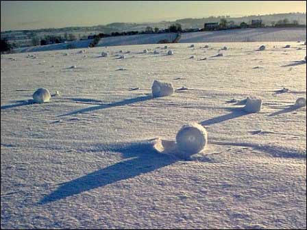 55岁的建筑商罗恩-特利维特(Ron Trevett)及54岁的妻子艾琳一天外出遛狗时,在住宅附近的田野上惊讶地发现了大量雪卷。特利维特夫妇居住在英国萨默塞特郡耶奥威尔(Yeovil)。特利维特说:“我们从远处看到它们在田地高处,心想可能是几个孩子在那玩耍,堆出的大雪球。可走到那里我们才发现周围根本没有脚印,总共有数百个雪卷,孩子们根本不可能堆出这么多。我们意识到一定是大风造就了这种奇特现象。”