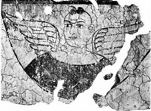 在新疆若羌县米兰佛寺出土的米兰壁画,为4世纪鄯善国时期的佛教遗迹,保存较好的壁画有释迦牟尼与6位弟子像,具有浓郁的希腊艺术风格。尤其是“有翼天使”画,共出土7幅,画面上呈现的是长有双翼的青少年男子形象。据研究,他们都是佛教中的香神,也就是音乐之神。在印度本土,他们身上没有翅膀。米兰有翼天使的形象显然是从希腊罗马艺术中的天使嫁接而来,可以说就是希腊神话中爱神的翻版。