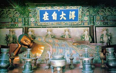 苏联作家爱伦堡,去年到我国来访问,曾经在北京住过一些时候,有一天,他去参观卧佛寺,那里有一尊佛像,和普通的佛像不同,是睡卧着的用一只手肘支着头,全身有两丈长,神气非常生动,据说还是元朝的雕塑,到今天已经有五六百年历史了。