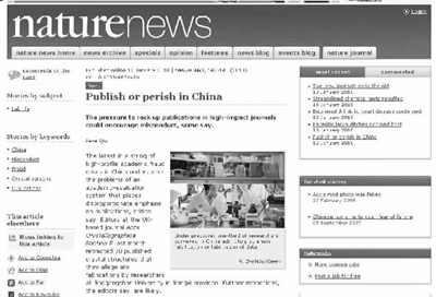 本报讯(记者万建辉)记者昨日登录《自然》杂志网站在线版,看到题为《中国科研,发表还是灭亡》(Publish or Perish in China)的头条评论文章(如右图)。