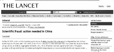 英国《柳叶刀》是世界上历史最悠久并具有同行评审性质的医学期刊之一。记者昨日登录《柳叶刀》电子版,找到名为《Scientific fraud: action needed in China》的社论。