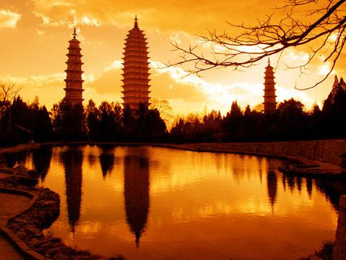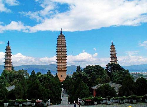 崇圣寺三塔是大理旅游的标志,是大理历史文化的见证。“万古云霄三塔影,诸天风雨一楼钟”,历来为人所乐道。建于公元834至840年的三塔主塔名叫千寻塔,高69.13米,与西安大小雁塔同为唐代典型建筑。三座塔形成鼎足之势,布局统一,造型和谐,浑然一体。