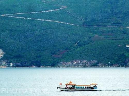 在大理港登舟离岸,但见海天一色,风月无边。在宽敞舒适的客舱里,一边陶醉于窗外银苍玉洱的旖旎风光,一边欣赏白族姑娘婀娜的舞姿,解读她们的绣花围腰、绣花鞋和包头上暗藏的“风花雪月”,品味她们用歌声与欢笑献给客人的“三道茶”。白族“三道茶”是白族人民待客的最高礼仪,一苦二甜三回味,据说象征人的一生,青年苦,中年甜,老年回味。能喝到它,绝对是贵客。“三道茶”源于唐初,南诏国中后期,佛教在大理兴起,寺庙里倡导坐禅饮茶,游客也喜欢饮茶止渴,茶道兴盛。经过宋、元时期到了明、清之际,白族家室多爱饮烤茶,招待客人饮甜茶,在婚事、节日期间专饮“三道茶”。如今白族“三道茶”已发展到极富内涵的茶文化的高度,形式三道茶之间都伴有霸王鞭、哭嫁、掐新娘、抢枕头等歌舞节目。与年轻漂亮的金花阿鹏共舞,顿觉山同人朗、水与情长,为旅途平添一层梦幻色彩。