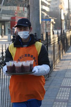2010年1月23日,腊八节后的第一天,朝阳区三里屯雅秀市场门前,一位昨天没喝上腊八粥的老奶奶,接过了三里屯一中高二年级的同学们奉送的爱心粥,瘦小的老人对孩子们说:“奶奶这心里呀,暖呼呼的……”
