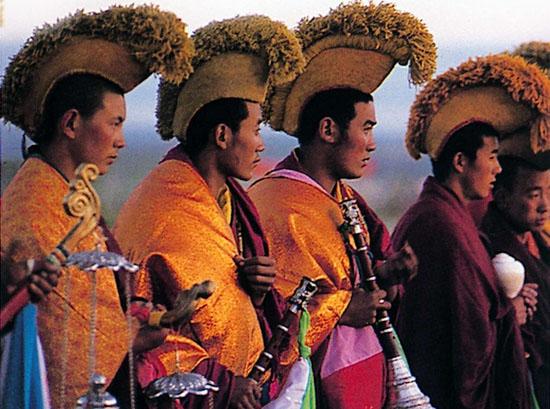 把凡是头戴五明佛冠,马缨飘飘的僧人通称为“喇嘛”,其名与实相去甚远。因此之故,外国人以为“喇嘛”们在佛教里加进去了许多成分,把佛教教义改造成了一个别的什么宗教,这是绝对无法容忍的误解!