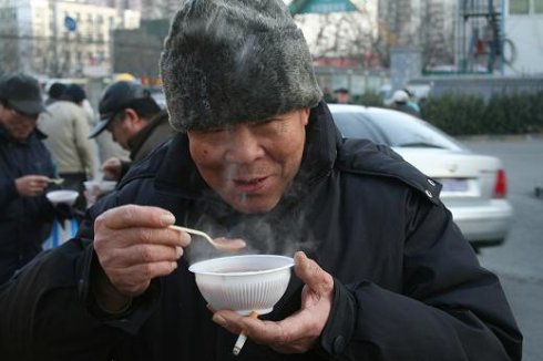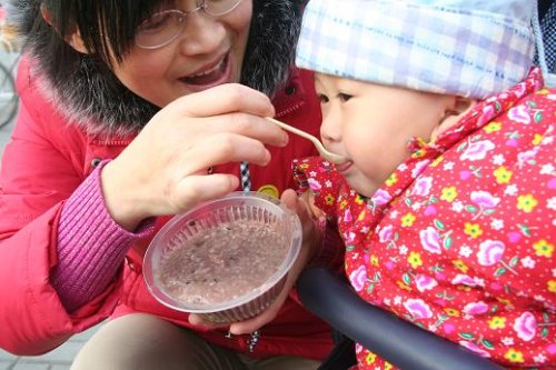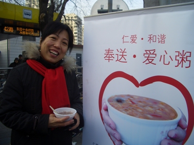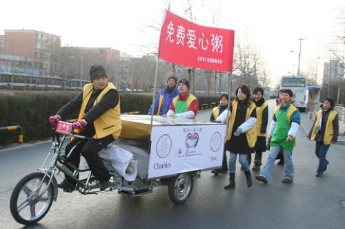 “新年好!今天是腊八节,香喷喷的腊八粥,欢迎大家来免费品尝……”义工们把特别订做的粥车停在公车站旁边,插上“免费爱心粥”的条幅,开始热情地“吆喝”起来。几个过路人停了下来驻足观望,马上就被殷勤的义工们引到粥车旁,接过一碗冒着热气的“腊八粥”,按自己的喜好加上糖。在几分好奇的气氛中,吃粥的人越来越多,粥车前一会儿就排起了队。