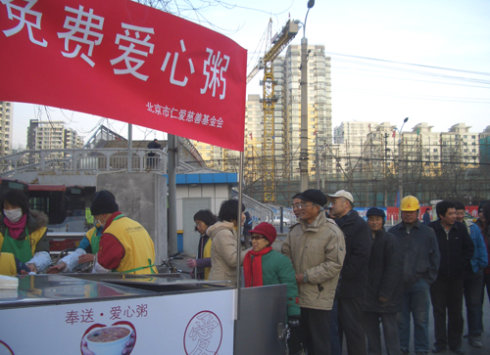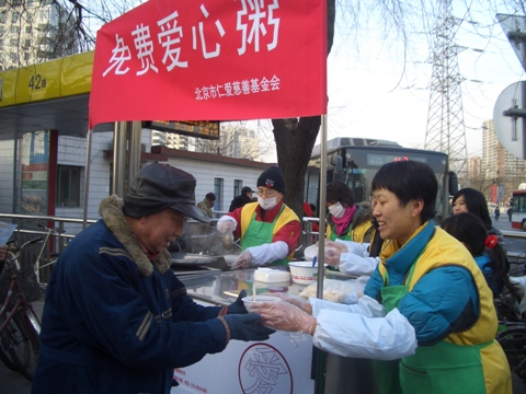 2009年1月3日,是中国传统节日的“腊八节”,也是位于北京市红莲中里小区的“仁爱心栈”成立一周年的日子。这个由北京市仁爱慈善基金会开办的社区服务小站,在过去的365天里,每日都风雨无阻地向小区居民提供免费的爱心粥。社区的许多老人都习惯了早上来这里喝一碗热乎乎的粥,跟着义工诵读《大学》、《弟子规》,或是聊聊天、谈谈心,义工们还会把粥送到一些行动不便的老人家中。在这个小小的“心栈”里,总是一副宾至如归、其乐融融的景象。
