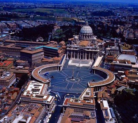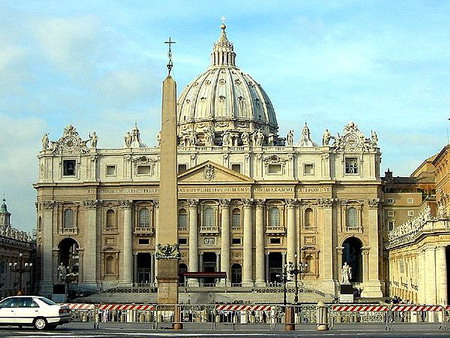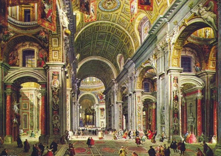 “巴罗克式”教堂建筑专指宗教改革运动之后在天主教内部为抵制这一宗教改革而形成的教堂建筑特色。巴罗克教堂建筑始于意大利罗马,在欧洲天主教国家和地区得到迅速发展,留下了许多艺术珍品。被誉为“巴罗克建筑之父”的波罗米尼率先以正弦弧和反弦弧构成的多变状曲线外形来设计罗马圣卡尔罗教堂,其凹凸分明的复杂构图及其布满十字形、八角形、圆形、四方形和弧形图案的椭圆状弯顶,典型体现出巴罗克艺术“畸形珍珠”之寓意。巴罗克教堂建筑之集大成者则为梵蒂冈圣彼得大教堂及其椭圆形大广场,其中米开朗基罗设计了教堂的大圆顶,而特别是贝尔尼尼所设计、于1655至1667年兴建的该教堂之前的椭圆形大广场乃最典型的“巴罗克”式广场,这一以方尖碑为中心,由4排共284根古希腊式圈形大石柱组成的半圆形大理石柱廊围绕而成的广场规模宏伟、想象奇特,加之其建筑物上众多的基督宗教历史人物和圣徒巨型雕像,造成了一种豪放、夸张的气势,令人惊讶和折服。因此,圣彼得大教堂广场堪称世界巴罗克艺术一绝。