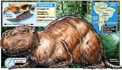不过,和在乌拉圭发现的一种豚鼠相比,窟山鼠就是小巫了:这种乌拉圭豚鼠比牛还大,体长3米,高1.5米,重达1吨,比矮象还要大得多。幸运的是这种可怕的硕鼠生活在200~400万年前。在当时,巴拿马地峡还未出现,南美洲和北美洲是分离的,南美洲实际上是一个大岛,北美洲的剑齿虎等天敌还过不去享用这些硕鼠。现在还生活在南美洲的花背豚鼠是硕鼠的近亲,而花背豚鼠的体长只有80厘米,体重只有75千克,这在现在啮齿动物中已经算是大的了。
