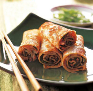 4.拿出一张烙好的薄饼,放上自己喜爱的配菜,卷在一起就可以开吃了。