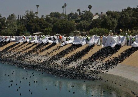 为了防止一种致癌物生成,让60万消费者放心使用饮用水,美国洛杉矶水电管理局把40万个黑色塑料球倒进了伊凡霍伊水库(Ivanhoe Reservoir)。这项发明的目的是避免太阳照射到水上面,从而防止一种含有溴化物和氯的潜在有害混合物在这个具有102年历史的水库中生成。