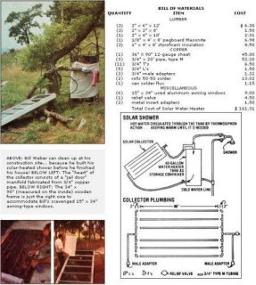 威廉·J·韦伯在《地球母亲新闻》上撰文介绍了他自己制作的这种太阳能热水器。他对所需的材料作了详细说明,还介绍了它的成本和制作过程。他用事实证明,热水器完全可以用你自己家里的材料制成,没有必要到市场上购买。