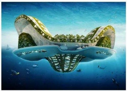 建筑师文森特·卡尔伯特(Vincent Callebaut)把这项发明叫做Lilypad,但它还有个更有名的名字,那就是“漂浮的气候难民生态人工岛”,因为科学家预测海平面将上长20到90厘米。这座漂浮的城市将于2100年变成现实,到时候有5万名富人在上面安家落户。