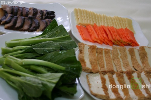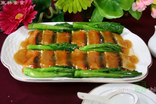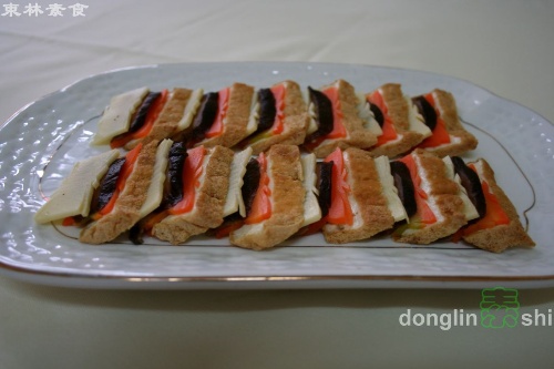 (6) 取腰盘,一片豆腐片,一片胡萝卜片, 一片香菇片, 一片冬笋片成一组,然后一组一组排好成二列,调味上笼蒸5分钟出笼,把汤汁滗出来调味最后用适量水淀粉勾薄芡即可(也可省略)淋在菜上,然后将广东菜心烫一下围在菜的边上即可。[麒麟豆腐调味加美极鲜味汁适量和素易鲜(上海地区有,还可以加蘑菇精)如果咸度不够可以加些盐,打芡勾薄芡(最后加一、二滴老抽拌匀调色,也可省略)淋在菜上]。