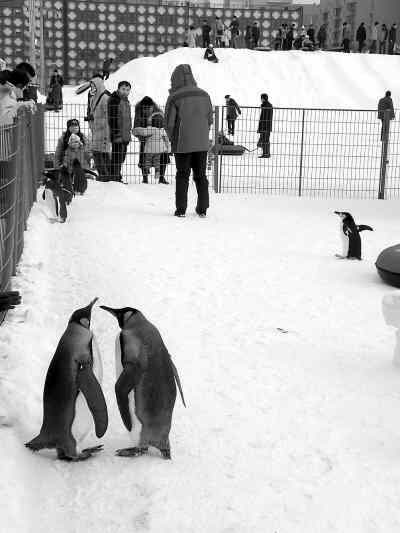 今年寒假,“到奥林匹克公园看企鹅”成为很多孩子外出游玩的第一选择。走进嘉年华内白雪覆盖的亲子乐园区,首先就能看到几个巨大的雪雕,顺着雪雕转过去,就能看到8只可爱的小企鹅,摇摆着肥肥的身体,列队欢迎游客。这可不是普通的企鹅,而是来自北极的王企鹅,有两只大个的差不多有半米高,据说是一对夫妻,这两只企鹅走到哪里都会形影不离,很是可爱。这八只企鹅可是冰雪嘉年华的贵宾,很多小朋友都是奔着看它们而来的。