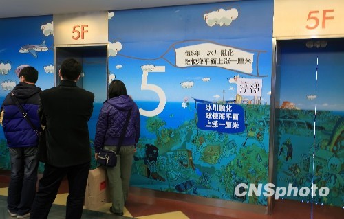 资料图:在北京西单一商场的电梯门外贴上了宣传环保、低碳、节能减排的宣传画,让人们在座电梯时,学到更多的环保知识,时时注意节能环保。(中新社发 老罗 摄)