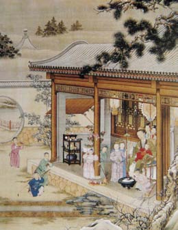 火药广泛应用于鞭炮。图为旧时过节放爆竹的情形。