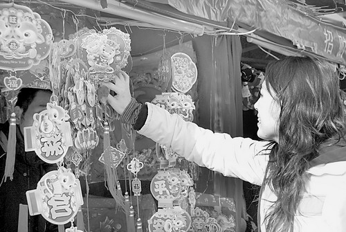 北京市民在街头年货摊挑选新年礼物摄影。 谌强
