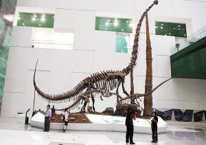目前最高最大的一座恐龙化石就在这里,它高达6.5米、长27米,还有个头较小的,可别小看它们,它们一个是有“中华第一龙”美誉的许氏禄丰龙,一个是罕见的食肉恐龙——双脊龙。三条龙脚下的土是从它们的出土地——云南专程运来,并搭上了不少零碎的化石。一旁的幕墙上,贴着三层楼高的巨幅画卷,上面画着恐龙时代的各种恐龙和远古的生活环境,与一旁“复活”的三条龙构成一种别样的视觉冲击。