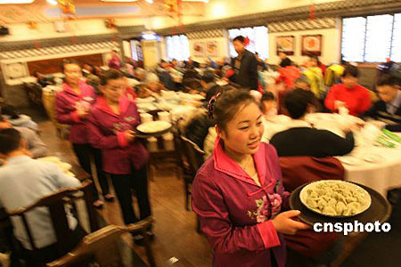 北京一家饺子楼的服务员给顾客上饺子。农历正月初五,俗称“破五”,民间素有吃饺子的习俗。从中午开始,北京许多饺子馆生意红火,一些市民通过吃饺子寄托对幸福生活和美好明天的期盼。 中新社发 陈晓根 摄