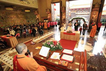 其实,佛教界早已有高僧大德们积极推行佛化婚礼的活动了。不久前,我在台湾宜兰别院看到了星云大师主持佛化婚礼的照片,很是庄严和温馨,体现了佛教亲和人间的精神。这些年,在上海等大城市里,一些著名寺院也时常为信徒举办佛化婚礼,获得社会的好评。大家在庄严活泼的仪式上真诚互动,营造出纯净高雅的氛围,将婚礼转化成砥砺信念的力量,其积极的意义是不容置疑的。