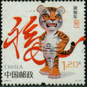2010年是农历的庚寅年,即“虎”年,中国邮政于1月5日发行《庚寅年》特种邮票,全套1枚,图案是背衬“福”字双手叉腰直立的一只小老虎。这是我国发行的第三轮生肖邮票的第七套;1986年1月5日发行第一轮生肖邮票第七套《丙寅年》特种邮票,全套1枚,图案是一只色彩斑斓,头顶“王”字的装饰画虎;1998年1月5日发行第二轮生肖邮票第七套《戊寅年》特种邮票,全套2枚,第一枚“虎虎生威”,图案是瞪大眼睛的一只布制玩具虎。第二枚“气贯长虹”,图案是一红色草书“虎”字。