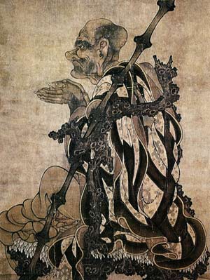 由此,我们可以不费力气地窥知,贯休绘画的旨趣,大致体现在这些方面:一是对于艺术和自己信仰执著追求并真诚不移;二是观察生活,日思夜想,连梦里也经常不断地涌现出创作对象的奇异状貌;三是禅理通于画理,在禅的灵机触发下挥毫运笔,从而获得一种高蹈出尘的狂逸旨趣。