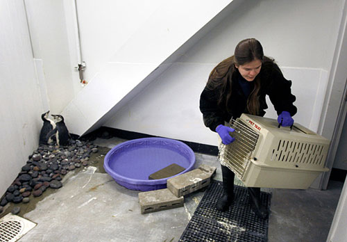 罗德岛纽波特水族馆的管理员准备用笼子运送Tica。