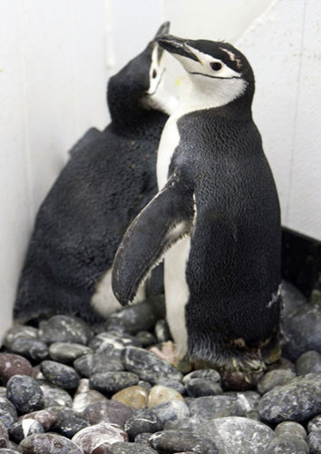 罗德岛纽波特水族馆,雄性南极帽带企鹅Tica(右)。