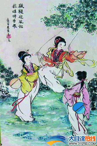古时的秋千多用树桠枝为架,再拴上彩带做成,后来逐步发展为用两根绳索加上踏板的秋千。